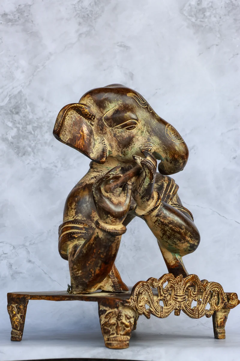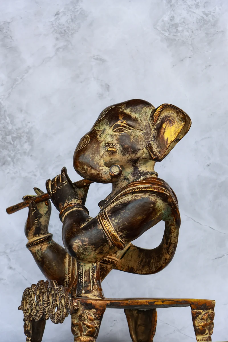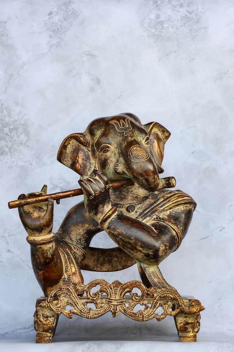 11″ Modern Flute Ganesha | Handcrafted Brass | Brown Patina Finish