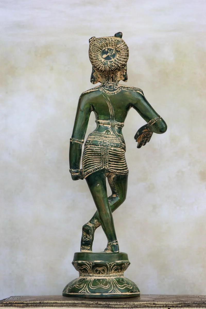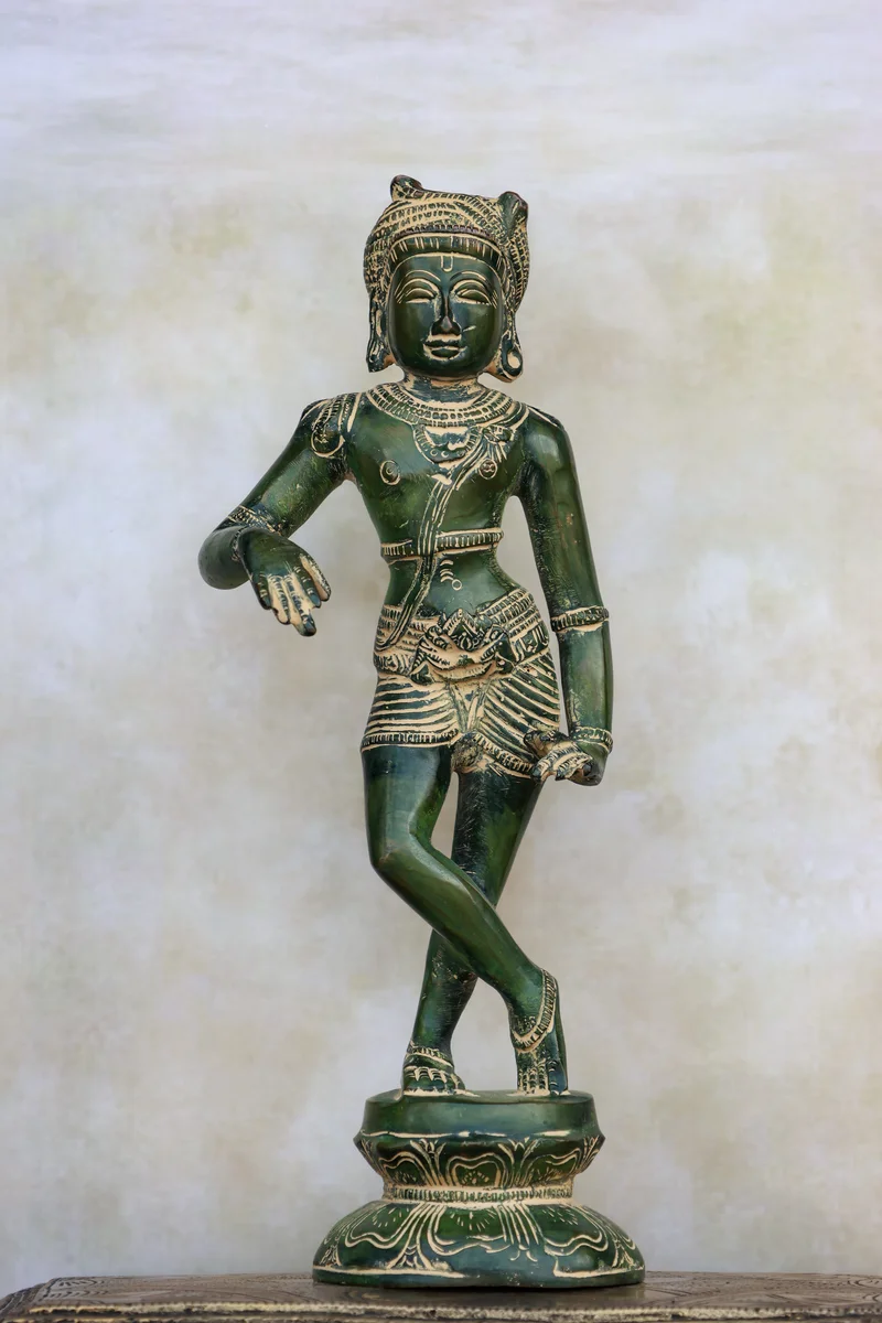 This 11″ Rishabadevar sculpture is handcrafted in brass and finished in a rich green patina. The calm stance and balanced posture reflect inner stillness and spiritual discipline, making it a refined addition to prayer spaces or curated interiors inspired by classical South Indian iconography.