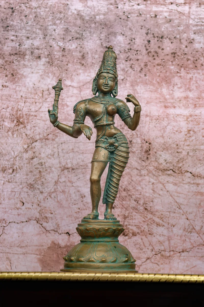 Ardhanareeswarar represents the divine union of Shiva and Parvati — the perfect balance of masculine strength and feminine grace. This handcrafted Panchaloha sculpture, finished in an antique green patina, beautifully captures this cosmic harmony in a fluid, elegant posture. A meaningful addition to any home altar, meditation space, or art collection, symbolising balance, unity, and completeness.