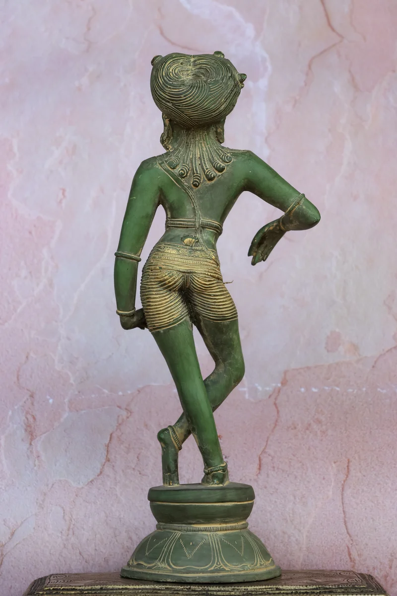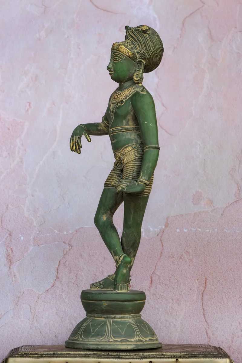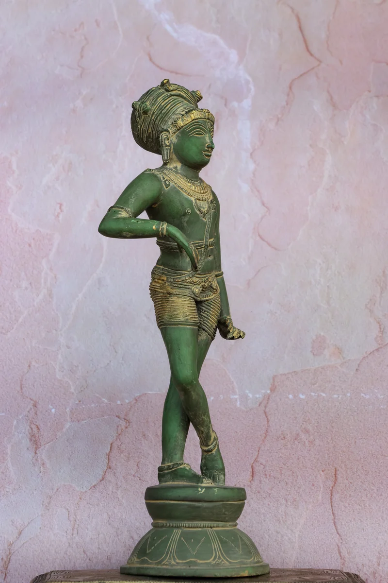 This 15″ Rishabadevar sculpture is handcrafted in brass and finished in a rich green patina. The calm stance and balanced posture reflect inner stillness and spiritual discipline, making it a refined addition to prayer spaces or curated interiors inspired by classical South Indian iconography.