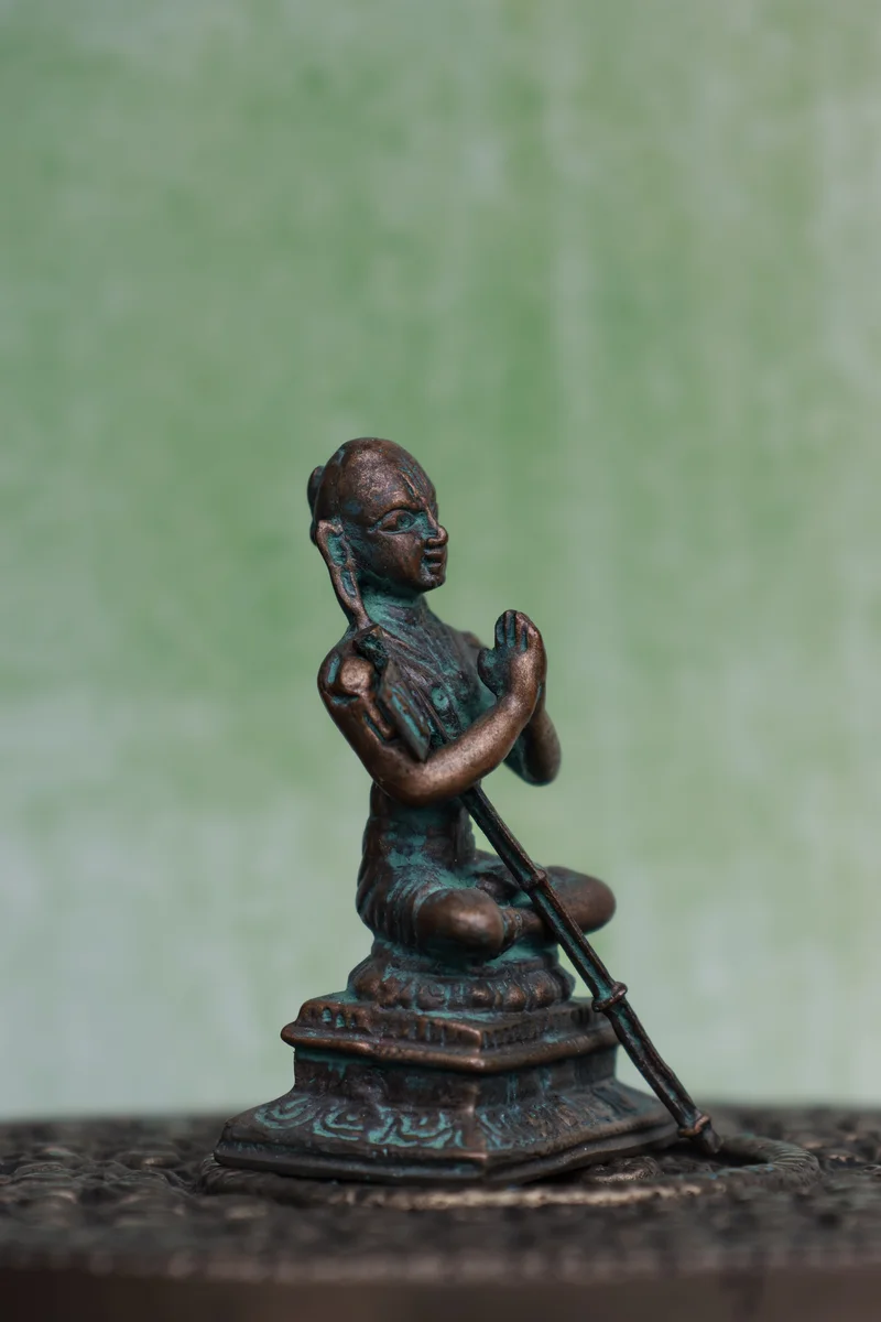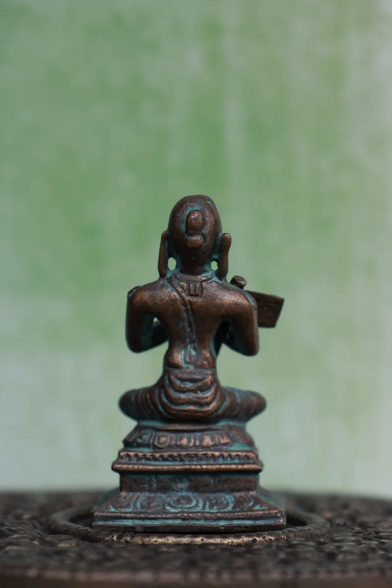 A compact yet powerful 2-inch sculpture of Sri Ramanujar, handcrafted in traditional Panchaloha and enhanced with a soothing green patina. Depicted in a serene namaskara mudra with the sacred Urdhva Pundra, this piece represents devotion, discipline, and the path of surrender taught by the great Vaishnava acharya.
