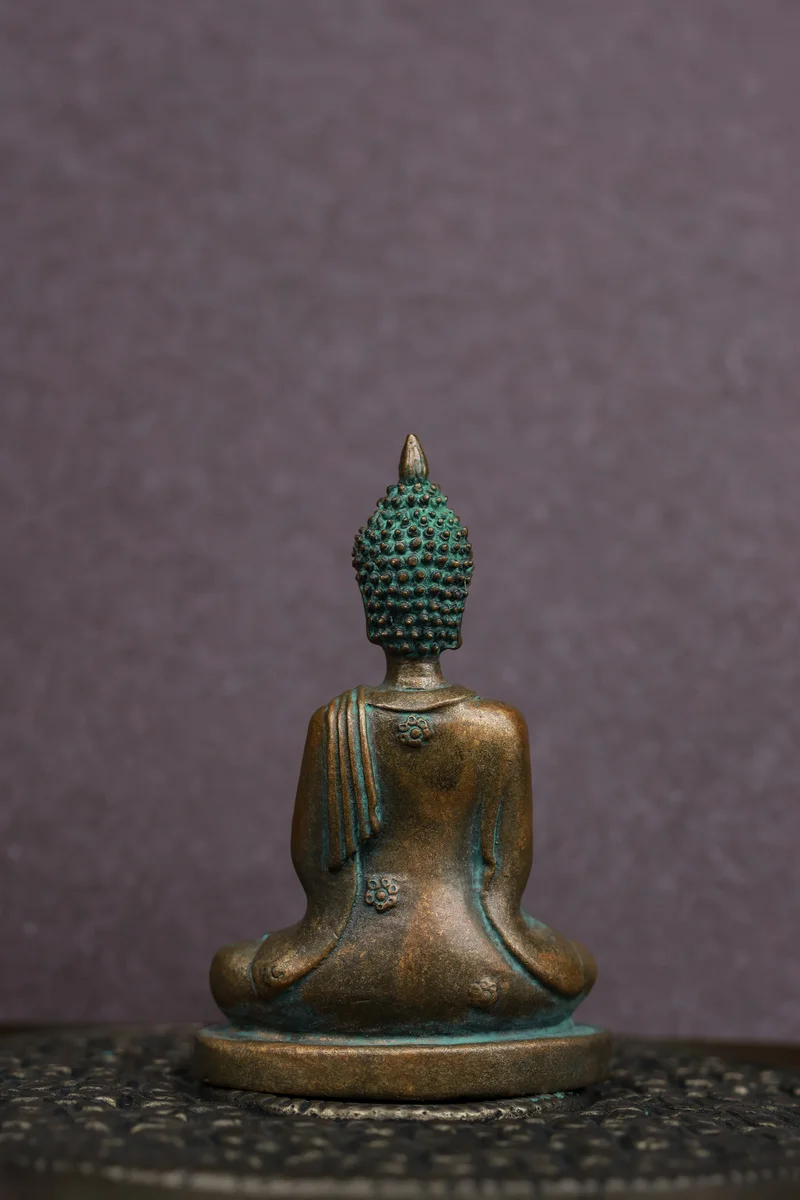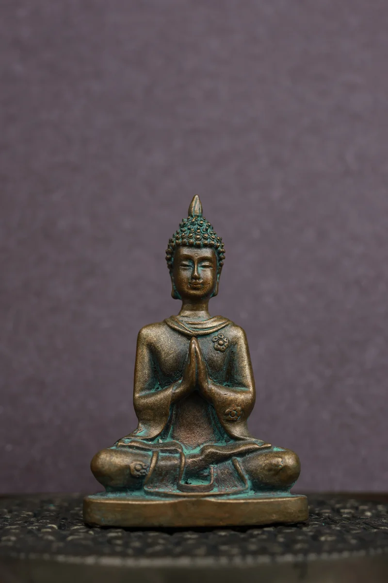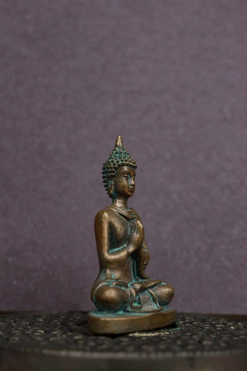 A serene 3-inch Buddha crafted in traditional Panchaloha and finished with a soothing green patina. Shown in Namaskara Mudra—the gesture of greeting, gratitude, and inner balance—this sculpture radiates peace and mindfulness. It’s a calming presence for your workspace, meditation corner, or home décor.