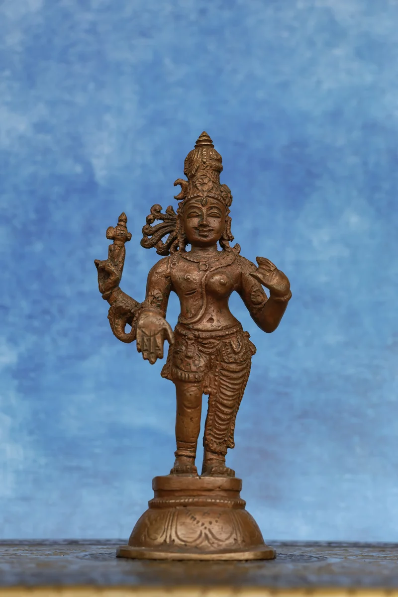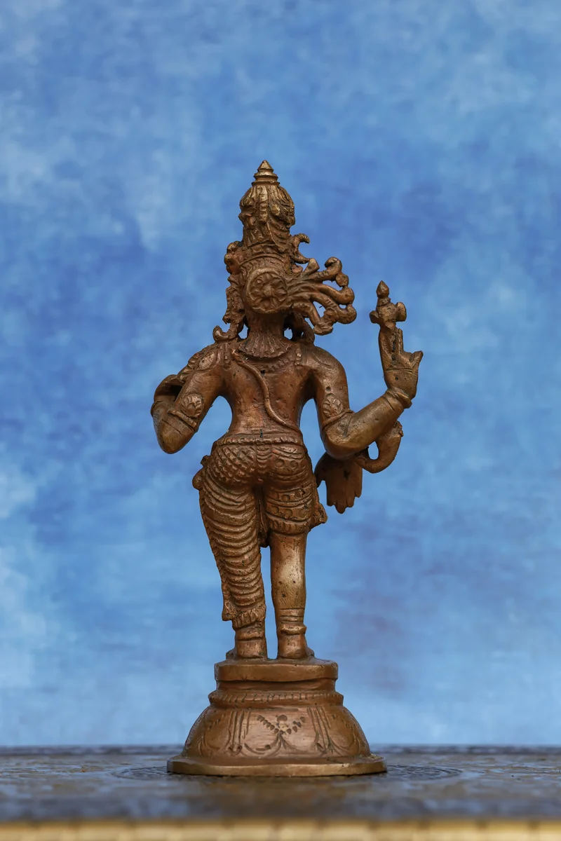 This handcrafted Aarthanareeswarar idol represents the divine union of Shiva and Parvati in one harmonious form. Half-masculine and half-feminine, it symbolises the perfect balance of strength and grace, logic and compassion. Finished in a beautiful wood-patina tone, this 6-inch sculpture brings an earthy, antique charm rooted in traditional panchaloha craftsmanship.