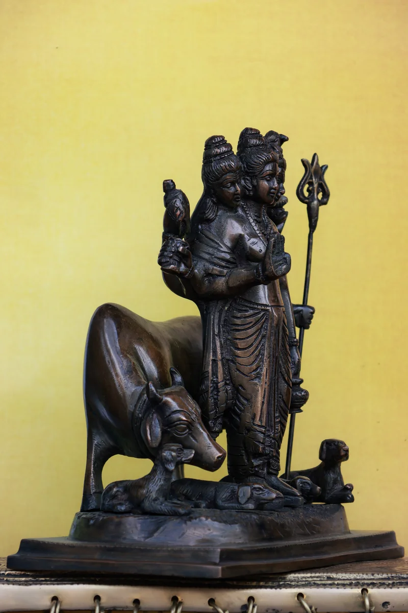 Dattatreya, the rare and powerful form symbolizing the unity of Brahma, Vishnu, and Shiva, represents balance, wisdom, and spiritual completeness. This handcrafted brass sculpture depicts him with serene authority, accompanied by the sacred cow and dogs, signifying dharma, loyalty, and the mastery over senses. Finished in a classic brown patina, this 8″ idol carries a timeless presence ideal for prayer rooms, meditation spaces, or collectors of traditional Hindu art.