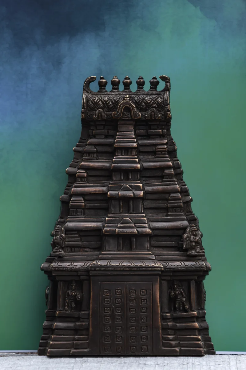 Crisp Dravidian details—tiered steps, kalashas, and guardian motifs—give it a temple-style presence without overwhelming your space. The wide base keeps it stable on flat surfaces, making it a beautiful backdrop for small brass idols or a standalone décor accent.