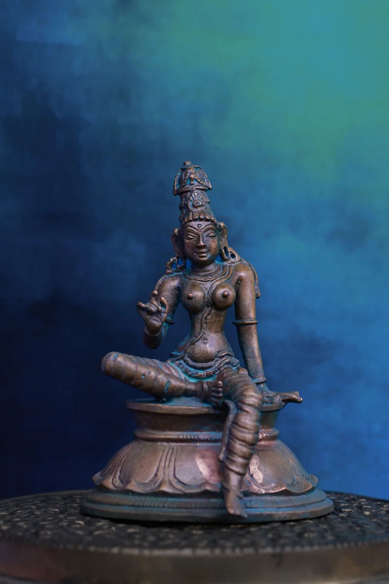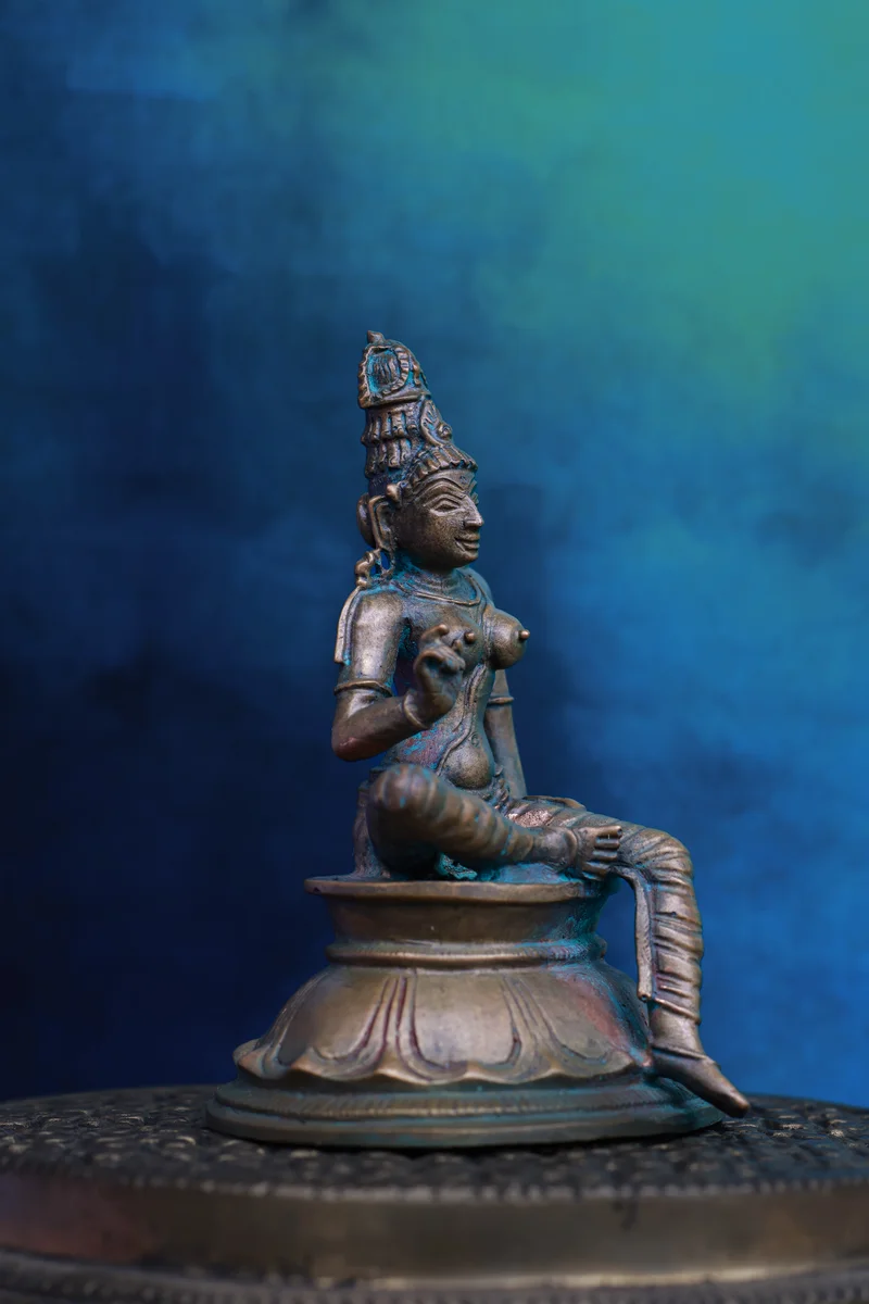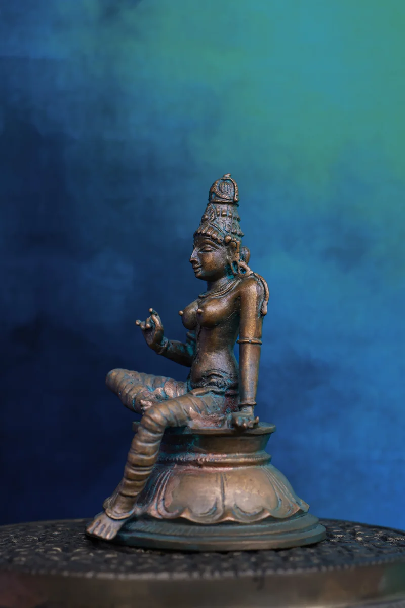 A graceful symbol of divine feminine power, this Boga Shakthi idol is crafted in sacred Panchaloha and finished with a green patina. The deity is portrayed in a relaxed seated posture, representing abundance, inner strength, and auspicious energy. At just 3.5 inches, it’s a compact yet striking piece that brings spiritual charm to any space.
