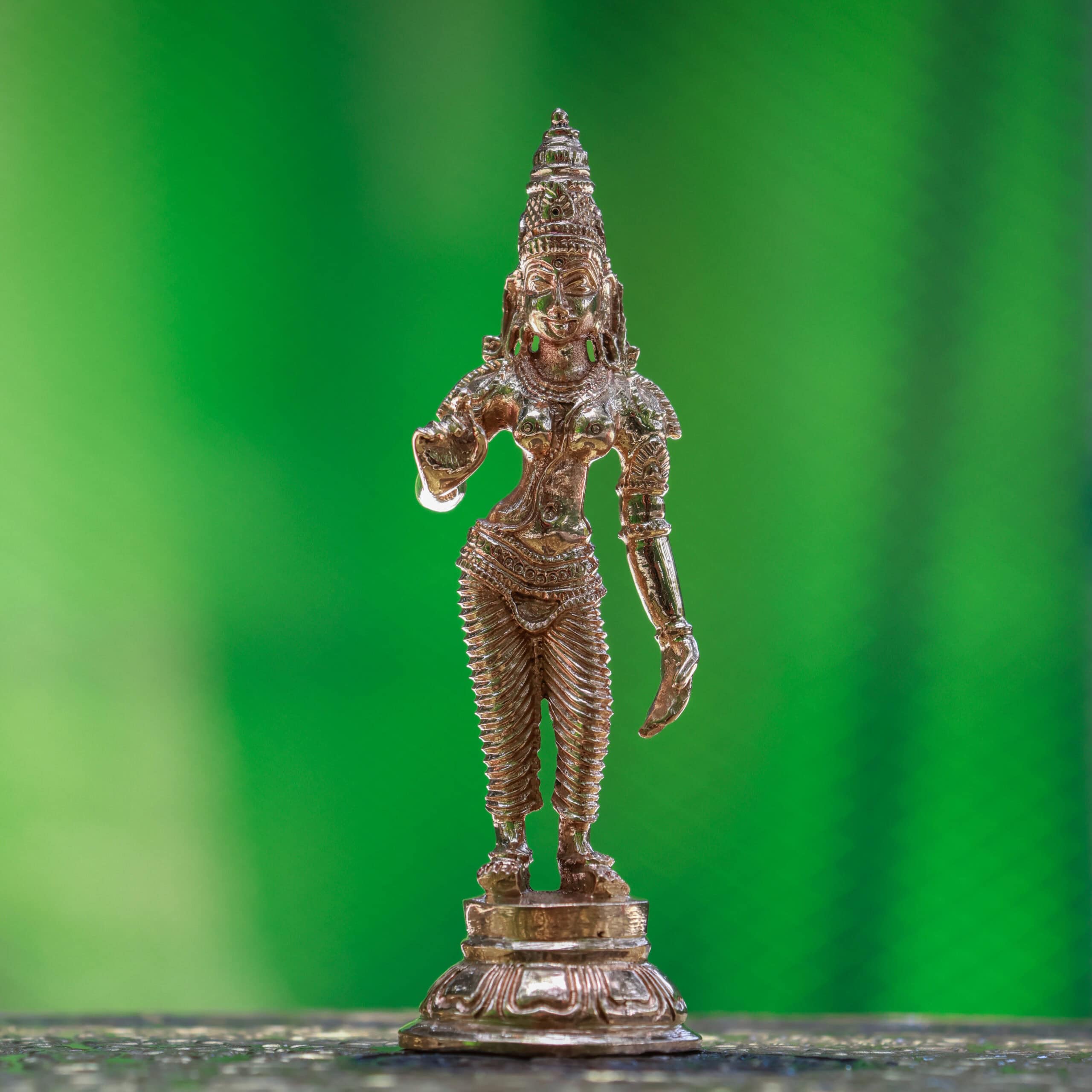 Each piece is carefully handcrafted in traditional Panchaloha (five-metal alloy) by master artisans. The fine detailing, elegant posture, and temple-style arch or base highlight the devotion and artistic heritage of South India.