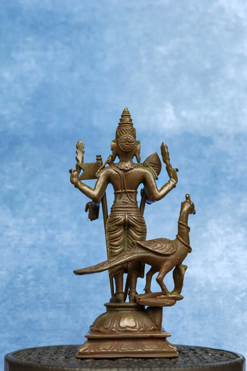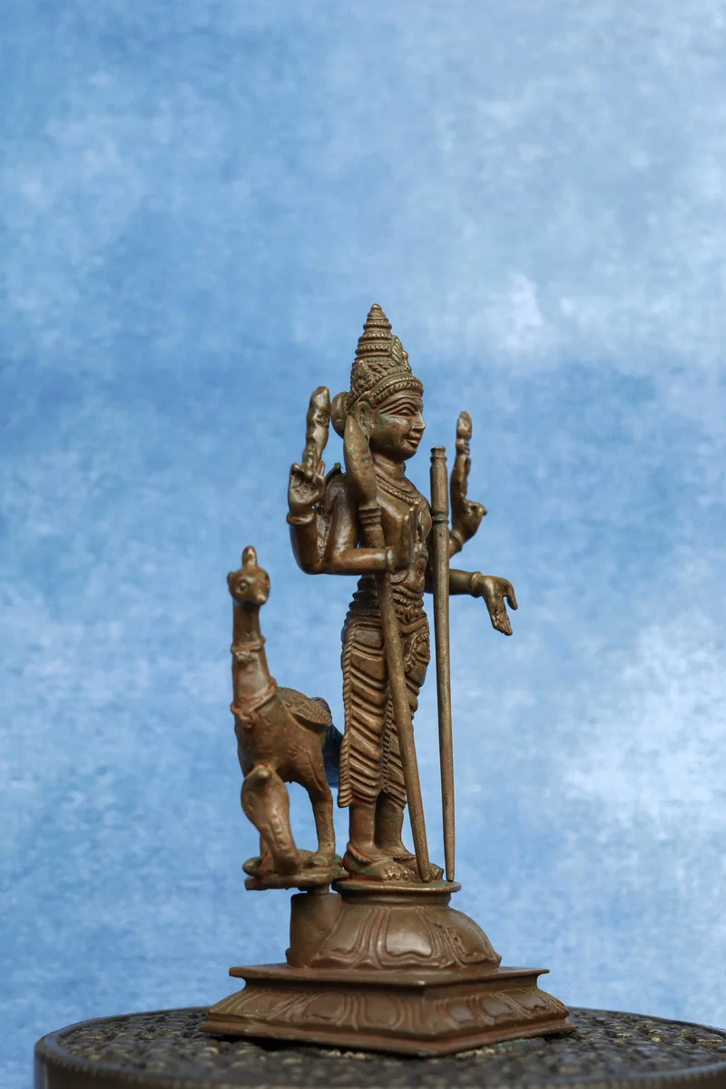 5.5″ Lord Murugan with Vel & Peacock | Handcrafted Panchaloha | Wood Patina