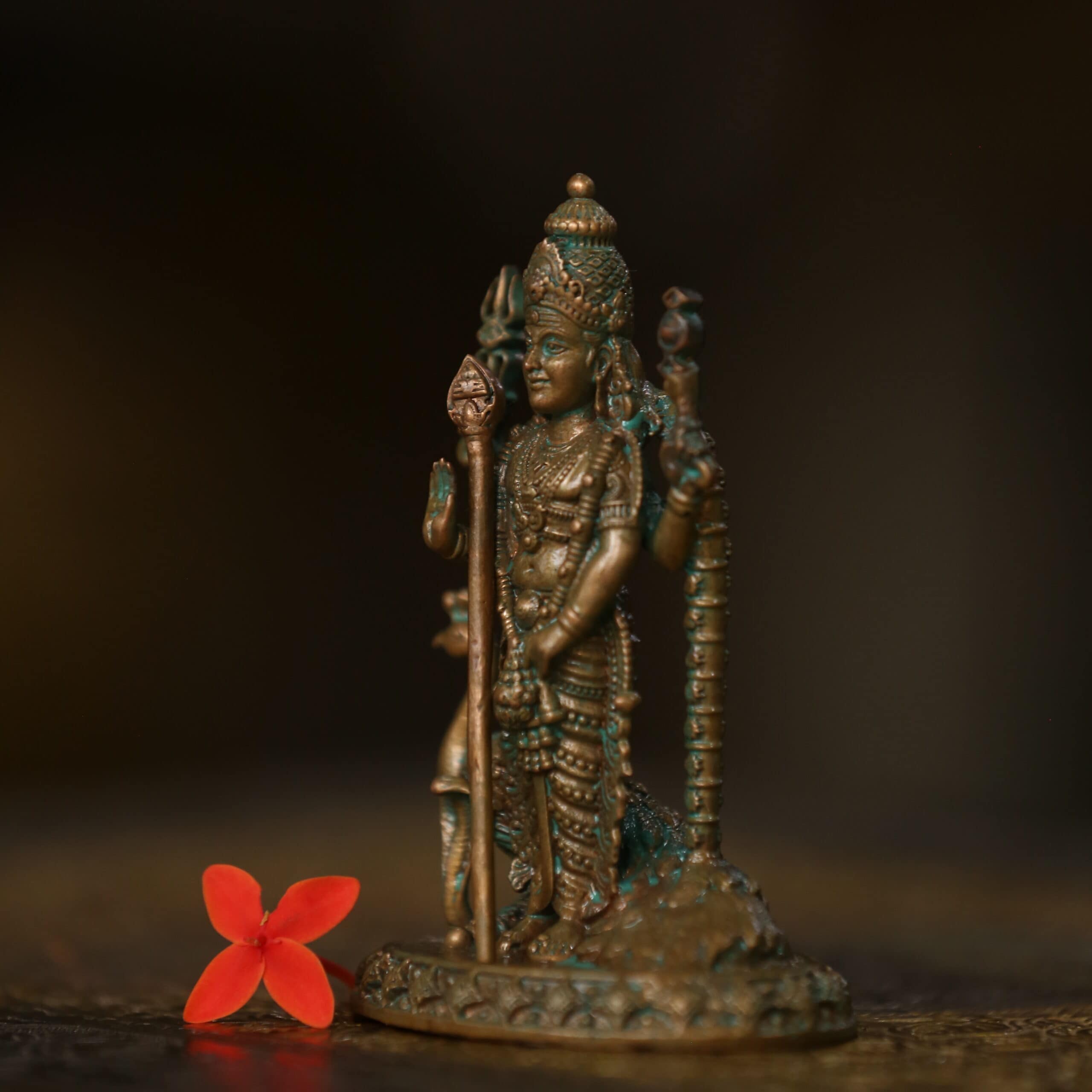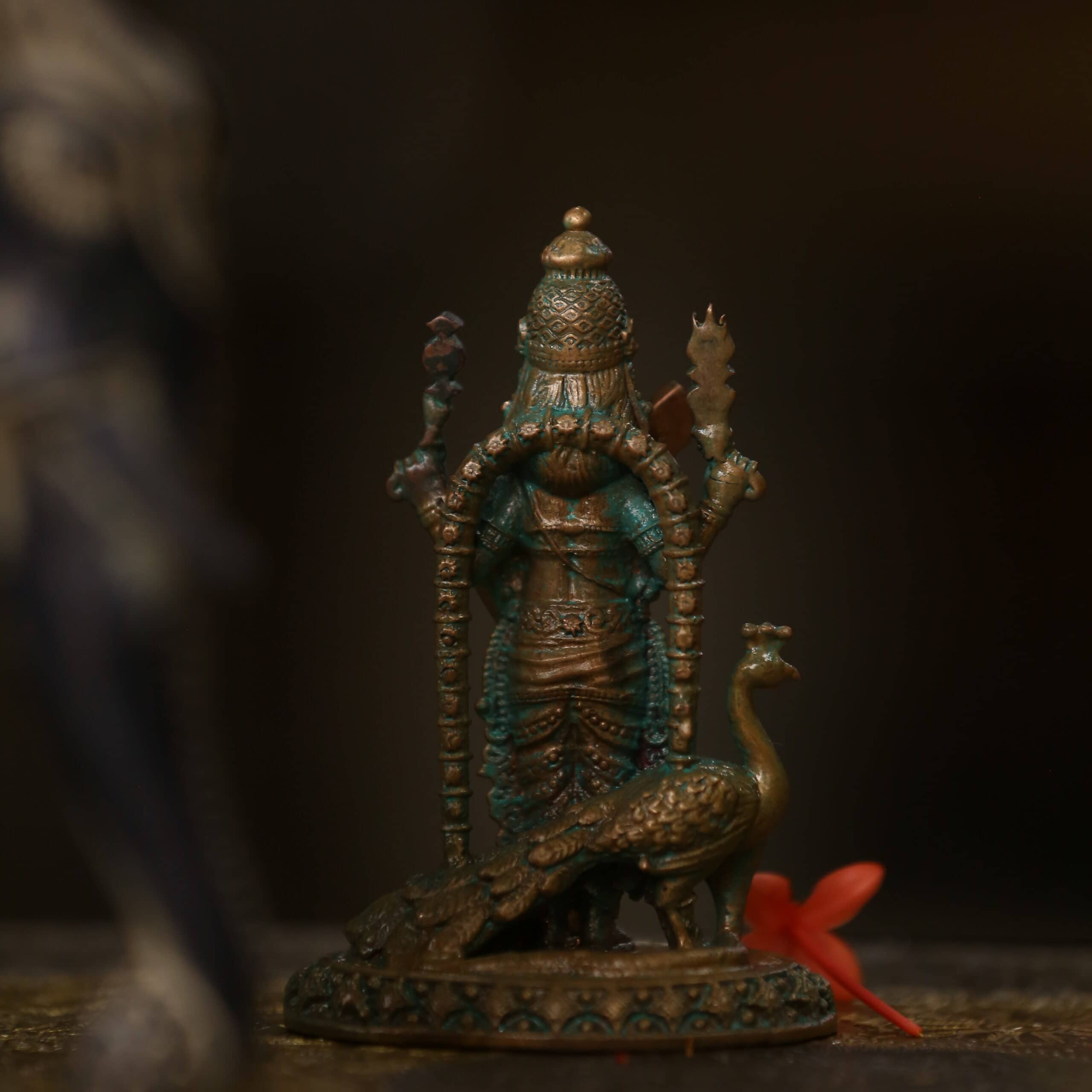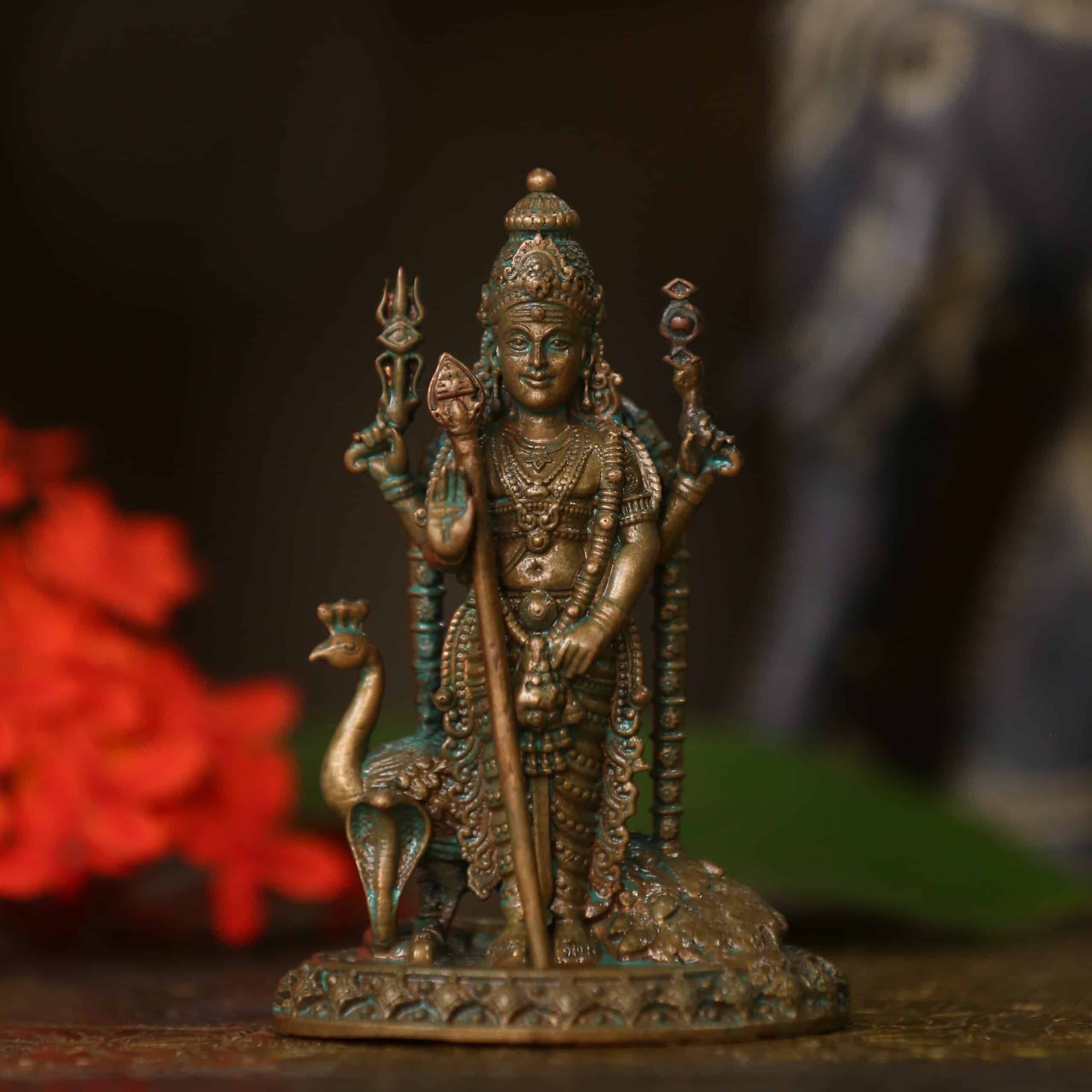 4″ Murugan Idol with Peacock | Handcrafted Panchaloha | Green Patina